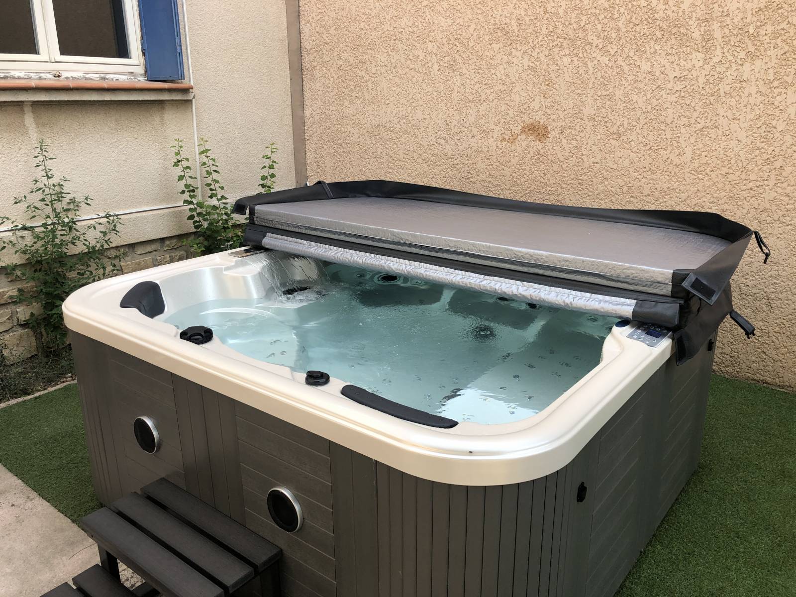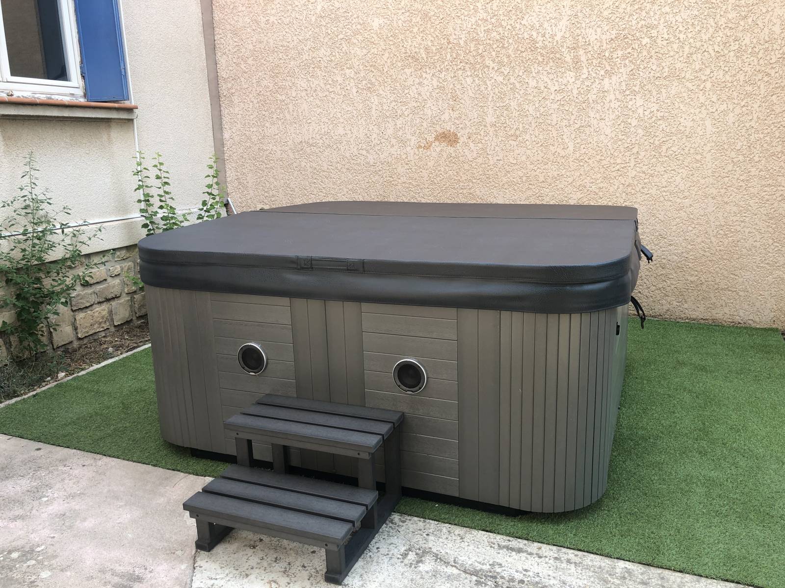 pelouse synthétique pour poser le spa.