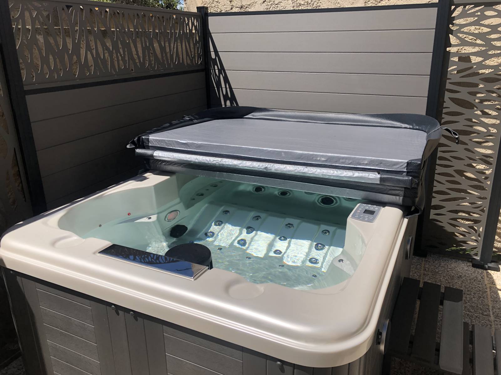 Ce spa4 personnes Caraïbes a ete installé dans la ville de Vitrolles dans un très joli angle caché par des brises vues, il fait partie des meilleurs choix de la gamme des spas d'Oorelax pour les budgets à petit prix. Possédant quatre places dont deux allongées, il permet de se détendre totalement à tout moment. Idéal pour les personnes ne disposant pas d'une grande place. Sa petite taille ne nuit absolument pas à son efficacité, disposant de 100 jets hydromassages alliant l'eau et l'air, afin offrir une meilleure relaxation sur quasiment la totalité de votre corps. De plus, il dispose d'un système de chromo thérapie (jeux de lumières) et d'une radio qui vous permettra d'écouter vos titres du moments à l'aide de votre smartphone. Étant donné qu'il fait parti de notre gamme, tous les accessoires peuvent s'accorder avec ce dernier pour améliorer votre confort.